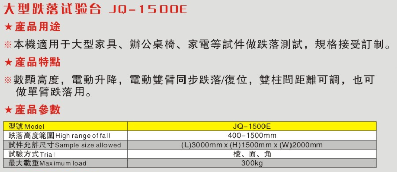產品型號:JQ-1500E 品牌:劍 喬 用途:大型雙臂跌落試驗機 該系列跌落試驗臺主要用于模擬包裝件在運輸、裝卸過程中受跌落沖擊的影響程度鑒定包裝件的耐沖擊強度及包裝設計的合理性。通過自由跌落對運輸包裝件進行垂