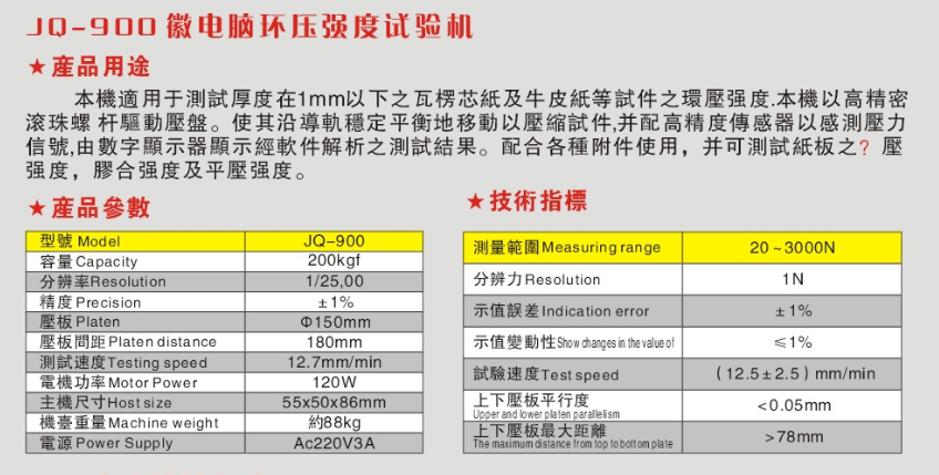 JQ-900 壓縮強度測試儀 紙品類環壓邊壓測試機 邊壓試驗機產品技術規格: